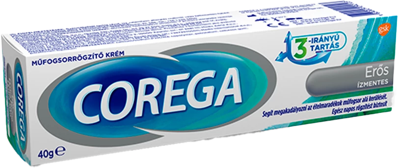 Egy műfogsorrögzítő használata biztosítja az Ön számára szükséges rögzítést és segít, hogy még felszabadultabbnak érezhesse magát egész nap. Ön olyan megoldást keres, ami nem változtatja meg kedvenc ételeinek ízét? A Corega Erős Ízmentes műfogsorrögzítő összetétele 3-irányú tartást biztosít és nem tartalmaz hozzáadott ízanyagokat, így nem fogja megakadályozni Önt abban, hogy élvezze az ételeket. A Corega Erős Ízmentes műfogsorrögzítő a Corega család része és cink, illetve mesterséges színezőanyag mentes.