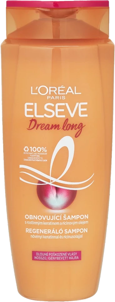 Gyönyörű, hosszú hajat szeretne, de ezt nem könnyű megvalósítani? A haja rengeteg hatásnak van kitéve, a hajhossz megviselt lesz, a hajvégek töredezetté válnak, és le kell őket vágni. Ismerje meg a titkunkat, mely segít elérni a hosszú hajat, amelyről álmodott! Krémes állagú, ápoló samponunk segít búcsút inteni a megviselt hajvégeknek. Összetétele egy hatékony kombinációval készült: - növényi keratinnal, mely beépül a hajába - vitaminokkal, melyek rendszeres használat mellett* erősebbé varázsolják a haját - ricinusolajjal, mely táplál, fényesít és segít megőrizni a haj hosszúságát.*Műszeres teszt többszöri alkalmazás után. Az Elseve Dream Long regeneráló és tisztító sampon egy NÖVÉNYI KERATINBÓL, VITAMINOKBÓL ÉS RICINUSOLAJBÓL álló erőteljes koktéllal van dúsítva, és: – regenerálja a hajat a hajtövektől a hajvégekig; – erősíti a hajat; – táplálja és fényessé teszi a hajat, hogy hosszú ideig egészséges és hosszú maradjon. *Műszeres vizsgálat több alkalmazás után