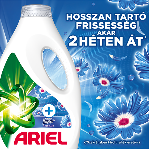 A Whirlpool, Electrolux, Candy és Beko mosógépgyártók által is ajánlott Ariel bemutatja az Ariel +Touch of Lenor Fresh Air folyékony mosószert. Hosszan tartó frissesség a ruháknak, akár 2 héten át (szekrényben tárolt ruhák esetén). Az Ariel +Touch of Lenor Fresh Air folyékony mosószer alacsonyabb mosási hőfokon is patyolattisztára mossa a ruhákat. Formuláját kifejezetten gyors tisztításhoz tervezték, TURBO CLEAN technológiával. Mosson hidegebb vízben az Ariel folyékony mosószerrel: takarítson meg energiát minden mosás alkalmával, és csökkentse a velejáró CO₂-kibocsátást. Mindemellett az Ariel folyékony mosószer 80%-ban biológiailag lebomló szerves összetevőket tartalmaz, és 100%-ban újrahasznosítható csomagolásban kerül forgalomba. Az Ariel +Touch of Lenor folyékony mosószer a foltok előkezelésére is alkalmas; használja hozzá a zöld kupakot, majd helyezze a ruhákat a mosógépbe. A legkiválóbb eredmény érdekében a mosószert tartalmazó adagolókupakot helyezze a mosógép dobjába.