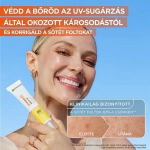 A C-VITAMIN* ragyogást adó ereje SPF50+ NAGYON MAGAS VÉDELMET nyújtó fényvédővel és ÁSVÁNYI PIGMENTEKKEL kombinálva egy könnyű, ragyogást adó, mindennapos fluidban. Azonnal: a bőr védett az UVB-, UVA- és hosszú hullámú UVA-sugárzással szemben a sötét foltok megelőzéséért. Nem hagy fehér réteget, nem zsíros, nem ragad, nem komedogén.