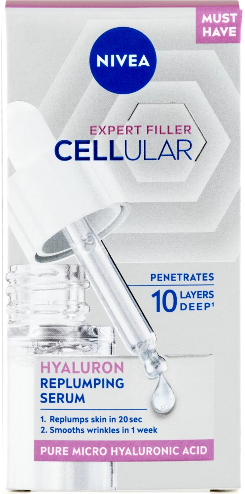 A NIVEA® Cellular Expert Filler hialuron feltöltő szérum egy hatékony ránctalanító megoldás a hidratált, puha, fiatalos kinézetű bőrért.
