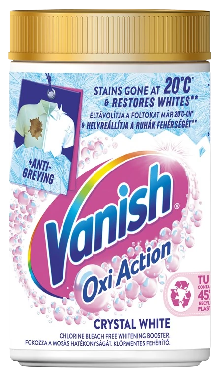 A Vanish Oxi Action Folteltávolító a makacs, beszáradt foltokat is eltávolítja, így már első használat után is tökéletesen tiszta, foltok nélküli eredményeket érhet el. A Vanish Oxi Action Fehérítő és Folteltávolító por hatóanyaga sokféle típusú foltot eltávolít, legyen az szemmel látható vagy nehezen észrevehető. Használata fehér ruhákhoz ajánlott.